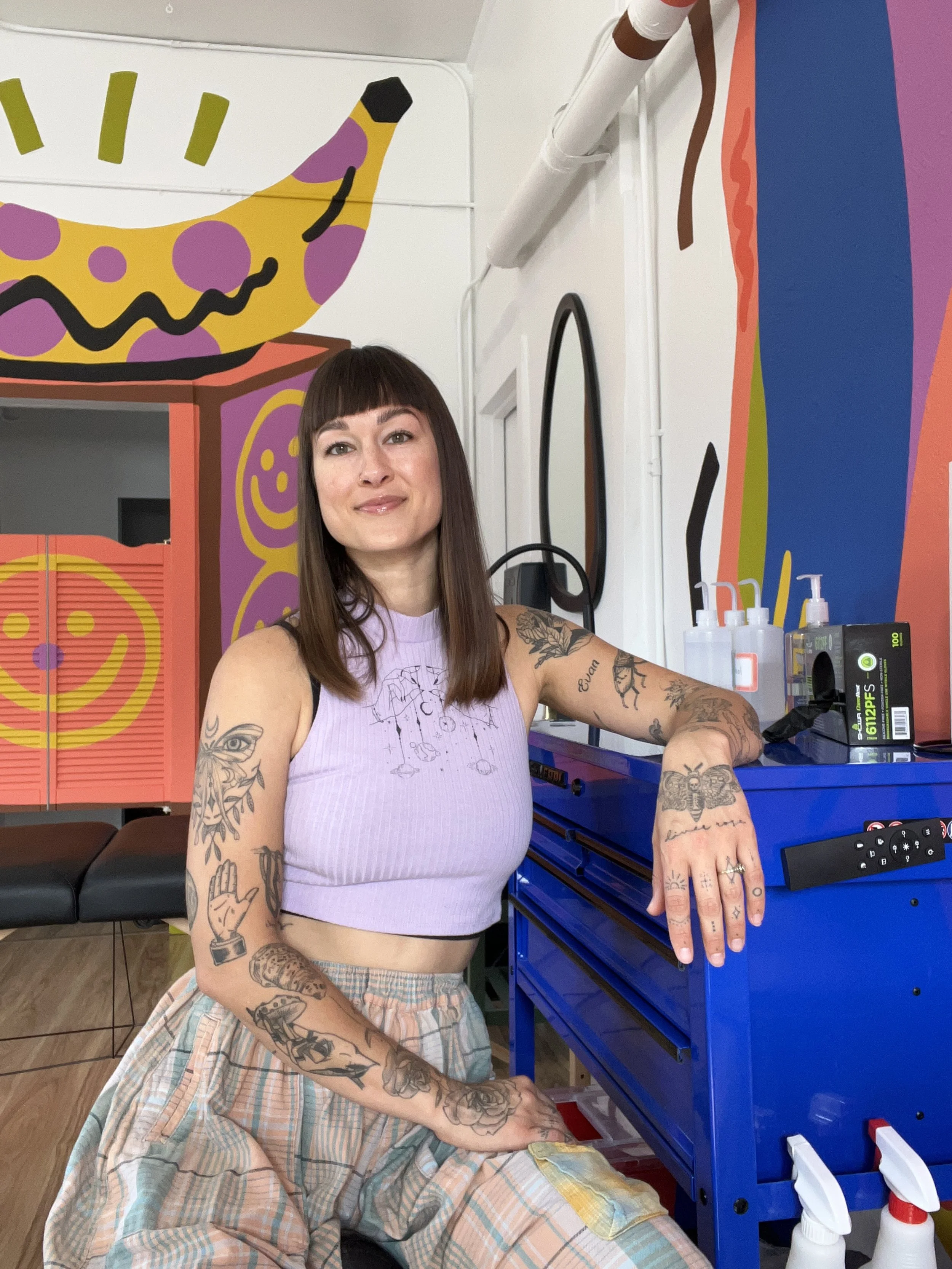 Hi, I’m Erin- a Los Angeles based Tattoo Artist who specializes in bold, fineline black work pieces with an emphasis on botanical and animal subject matter. I strive to create a welcoming and inclusive environment where everyone who walks in my door feels comfortable and embraced.